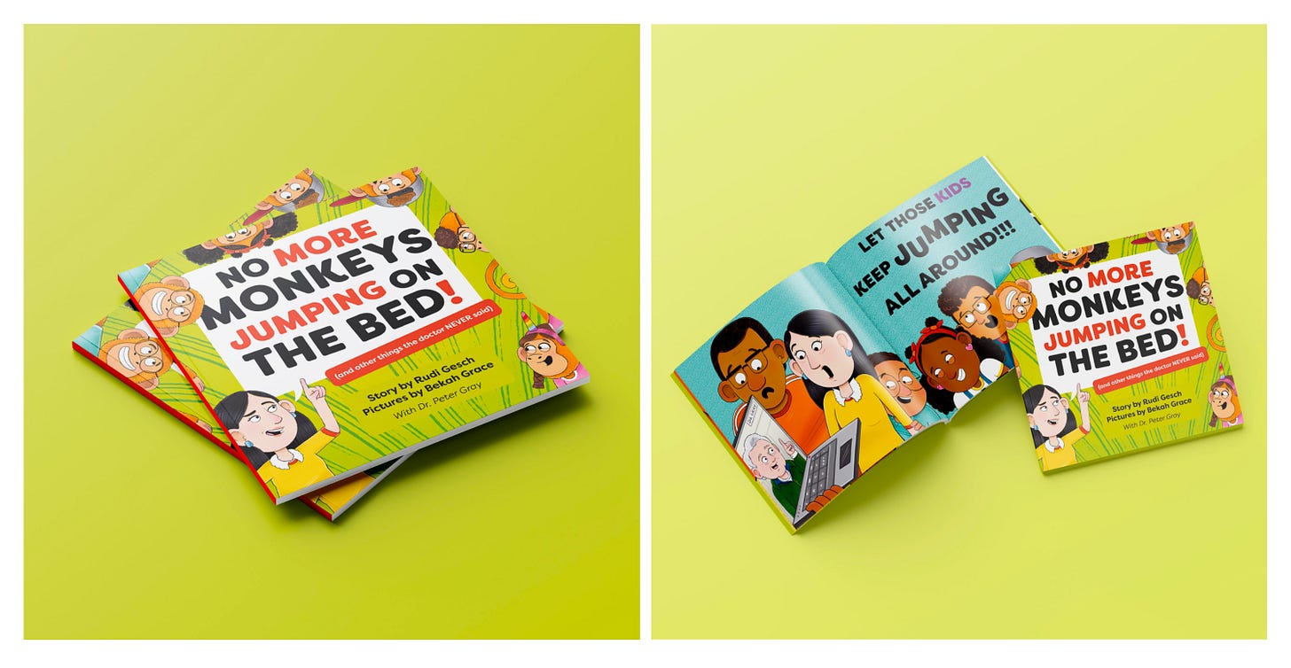Illustrating this book for the author, Rudi Gesch has been so much fun. These little “monkeys” love jumping and maybe…just maybe…they should be allowed to jump!